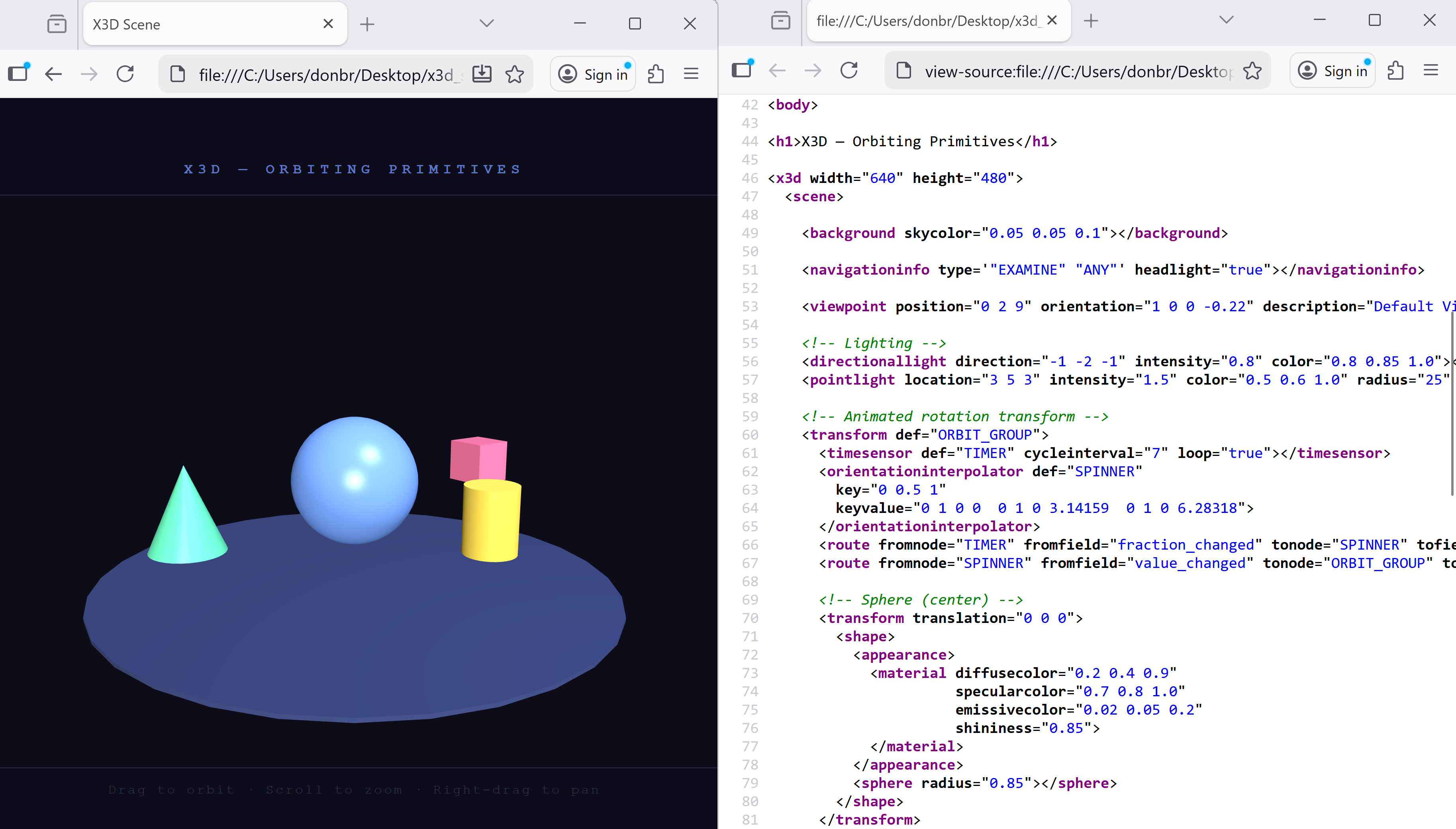 and non-standard lower-case X3D syntax embedded in an HTML page.