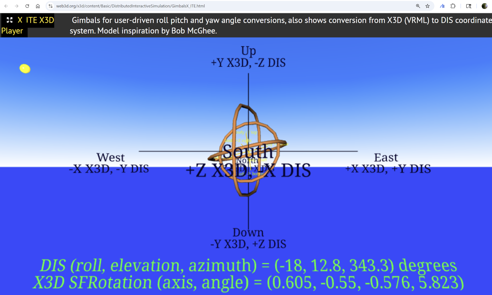 6 | <meta name='description' content='Gimbals for user-driven roll pitch and yaw angle conversions, also shows conversion from X3D (VRML) to DIS coordinate system. Model inspiration by Bob McGhee.'/> |