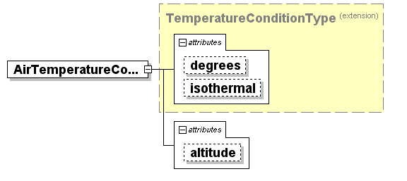 | source | <xs:element name="AirTemperatureCondition" substitutionGroup="TemperatureCondition"> <xs:annotation> <xs:appinfo>Holds the air temperature value and the base altitude at which this temperature begins. Temperature is assumed to decrease as altitude increases from the base altitude unless isothermal is set to true.</xs:appinfo> </xs:annotation> <xs:complexType> <xs:complexContent> <xs:extension base="TemperatureConditionType"> <xs:attribute name="altitude" type="nonNegativeFloat" default="0"/> </xs:extension> </xs:complexContent> </xs:complexType> </xs:element> |