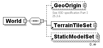 | source | <xs:element name="World"> <xs:annotation> <xs:appinfo>Defines the largely static environment in which the simulation will run. It will contain all terrain features (terrain and bathymetry), associated charts or maps, and any buildings or other significant model data which will not be tracked for movement or other actions.</xs:appinfo> </xs:annotation> <xs:complexType> <xs:complexContent> <xs:extension base="FullyExtensibleSMALElementType"> <xs:sequence> <xs:element ref="GeoOrigin" minOccurs="0"/> <xs:element ref="TerrainTileSet"/> <xs:element ref="StaticModelSet" minOccurs="0" maxOccurs="unbounded"/> </xs:sequence> </xs:extension> </xs:complexContent> </xs:complexType> </xs:element> |