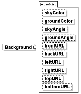 | source | <xs:element name="Background"> <xs:annotation> <xs:appinfo>Holds information for filling the X3D Background node which is used to set up a skybox or simple background colors.</xs:appinfo> </xs:annotation> <xs:complexType> <xs:complexContent> <xs:extension base="FullyExtensibleSMALElementType"> <xs:attribute name="skyColor" type="xs:string"/> <xs:attribute name="groundColor" type="xs:string"/> <xs:attribute name="skyAngle" type="xs:float"/> <xs:attribute name="groundAngle" type="xs:float"/> <xs:attribute name="frontURL" type="xs:anyURI"/> <xs:attribute name="backURL" type="xs:anyURI"/> <xs:attribute name="leftURL" type="xs:anyURI"/> <xs:attribute name="rightURL" type="xs:anyURI"/> <xs:attribute name="topURL" type="xs:anyURI"/> <xs:attribute name="bottomURL" type="xs:anyURI"/> </xs:extension> </xs:complexContent> </xs:complexType> </xs:element> |