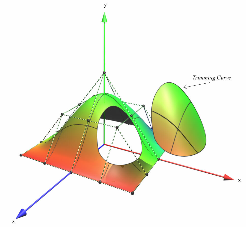 The trimming curve specifies a NURBS-curve that limits the NURBS surface in order to create NURBS surfaces that contain holes or have smooth boundaries. Trimming curves are curves in the parametric space of the surface.