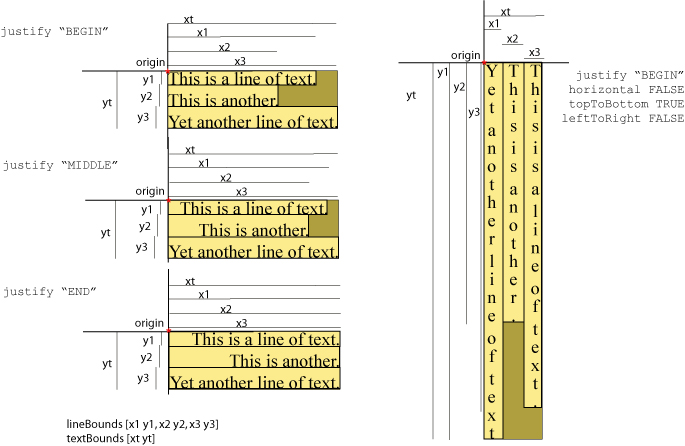 The major alignment is along the X-axis when horizontal is TRUE and along the Y-axis when horizontal is FALSE. The minor alignment is along the Y-axis when horizontal is TRUE and along the X-axis when horizontal is FALSE. The possible values for each enumerant of the justify field are "FIRST", "BEGIN", "MIDDLE", and "END". For major alignment, each line of text is positioned individually according to the major alignment enumerant. For minor alignment, the block of text representing all lines together is positioned according to the minor alignment enumerant. Tables 15.2-15.5 describe the behaviour in terms of which portion of the text is at the origin.