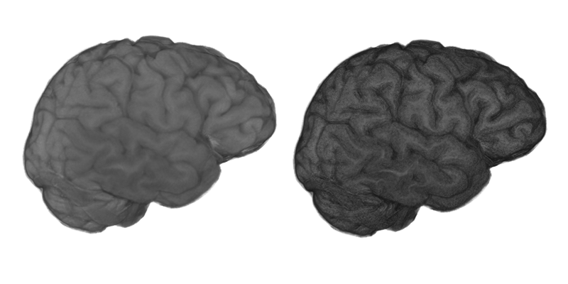 Figure 41.11 shows a basic image of a human brain on the left and an image of the human brain using ShadedVolumeStyle on the right.
