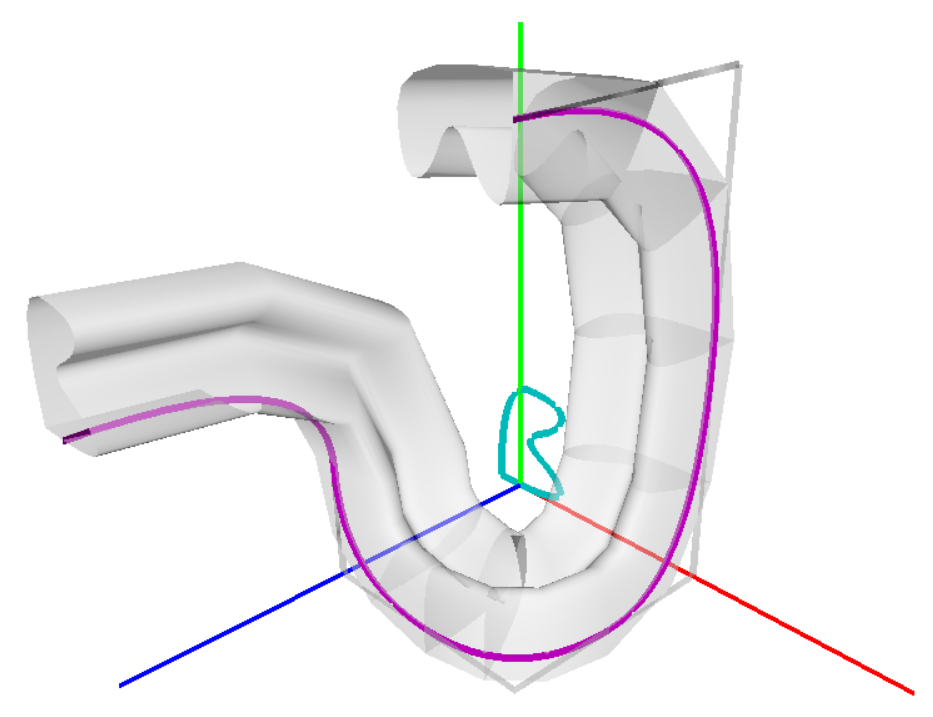 NurbsSweptSurface describes a generalized surface that defines a path in 3D space and constant cross section that may be 2D or 3D of the path as illustrated in Figure 27.3. Conceptually it is the NURBS equivalent of the Extrusion node (see 13.3.5 Extrusion) but permits the use of non-closed cross sections.