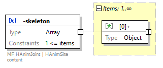 | source code | "-skeleton": { "description": "MF HAnimJoint | HAnimSite content", "type": "array", "minItems": 1, "items": { "type": "object", "properties": { "HAnimJoint": { "$ref": "#/definitions/HAnimJoint" }, "HAnimSite": { "$ref": "#/definitions/HAnimSite" }, "ProtoInstance": { "$ref": "#/definitions/ProtoInstance" } }, "additionalProperties": false } } |