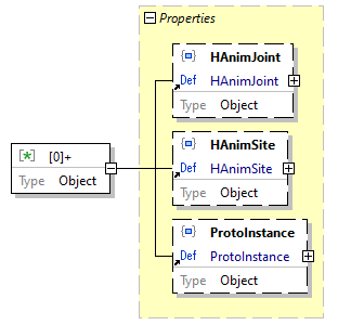 | source code | { "type": "object", "properties": { "HAnimJoint": { "$ref": "#/definitions/HAnimJoint" }, "HAnimSite": { "$ref": "#/definitions/HAnimSite" }, "ProtoInstance": { "$ref": "#/definitions/ProtoInstance" } }, "additionalProperties": false } |