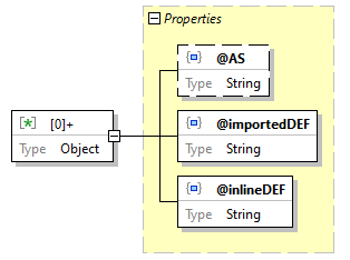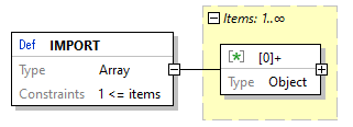 | source code | "IMPORT": { "type": "array", "minItems": 1, "items": { "type": "object", "properties": { "@AS": { "type": "string" }, "@importedDEF": { "type": "string" }, "@inlineDEF": { "type": "string" } }, "required": [ "@importedDEF", "@inlineDEF" ], "additionalProperties": false } } |