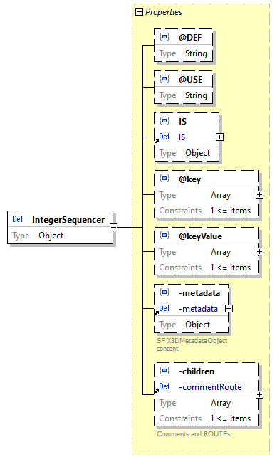 | source code | "IntegerSequencer": { "type": "object", "properties": { "@DEF": { "type": "string" }, "@USE": { "type": "string" }, "IS": { "$ref": "#/definitions/IS" }, "@key": { "type": "array", "minItems": 1, "items": { "type": "number" } }, "@keyValue": { "type": "array", "minItems": 1, "items": { "type": "integer" } }, "-metadata": { "$ref": "#/definitions/-metadata" }, "-children": { "$ref": "#/definitions/-commentRoute" } }, "additionalProperties": false } |
