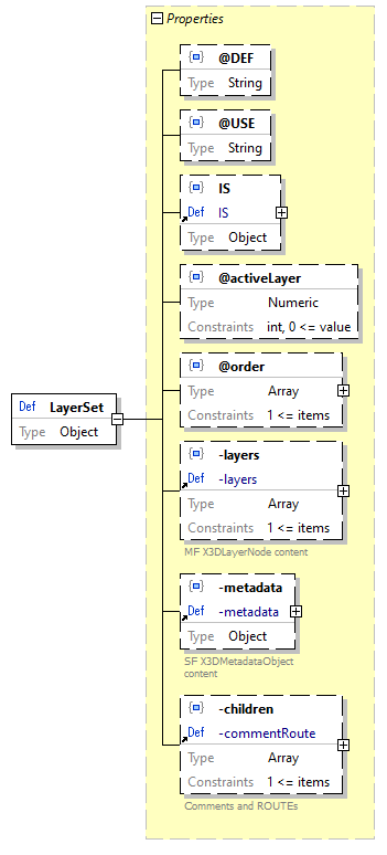 | source code | "LayerSet": { "type": "object", "properties": { "@DEF": { "type": "string" }, "@USE": { "type": "string" }, "IS": { "$ref": "#/definitions/IS" }, "@activeLayer": { "type": "integer", "minimum": 0, "default": 0 }, "@order": { "type": "array", "minItems": 1, "items": { "type": "integer", "minimum": 0, "default": 0 } }, "-layers": { "$ref": "#/definitions/-layers" }, "-metadata": { "$ref": "#/definitions/-metadata" }, "-children": { "$ref": "#/definitions/-commentRoute" } }, "additionalProperties": false } |