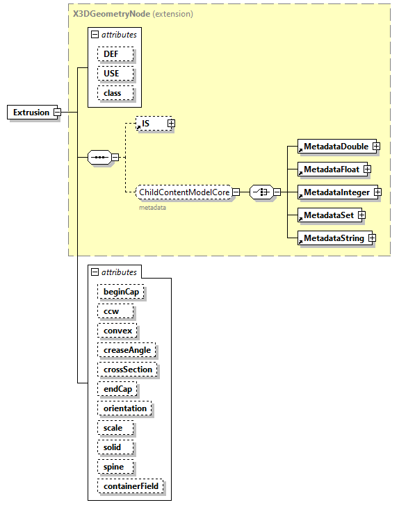| source | <xs:element name="Extrusion"> <xs:annotation> <xs:appinfo> <xs:attribute name="beginCap" type="SFBool" default="true" fixed="inputOnlyField"/> <xs:attribute name="ccw" type="SFBool" default="true" fixed="inputOnlyField"/> <xs:attribute name="convex" type="SFBool" default="true" fixed="inputOnlyField"/> <xs:attribute name="creaseAngle" type="SFBool" default="0" fixed="inputOnlyField"/> <xs:attribute name="crossSection" type="MFVec2f" default="1 1 1 -1 -1 -1 -1 1 1 1" fixed="inputOnlyField"/> <xs:attribute name="endCap" type="SFBool" default="true" fixed="inputOnlyField"/> <xs:attribute name="orientation" type="MFRotation" default="0 0 1 0" fixed="inputOnlyField"/> <xs:attribute name="scale" type="MFVec2f" default="1 1" fixed="inputOnlyField"/> <xs:attribute name="solid" type="SFBool" default="true" fixed="initializeOnlyField"/> <xs:attribute name="spine" type="MFVec3f" default="0 0 0 0 1 0" fixed="inputOnlyField"/> <xs:attribute name="set_crossSection" type="MFVec2f" fixed="inputOnlyField"/> <xs:attribute name="set_orientation" type="MFRotation" fixed="inputOnlyField"/> <xs:attribute name="set_scale" type="MFVec2f" fixed="inputOnlyField"/> <xs:attribute name="set_spine" type="MFVec3f" fixed="inputOnlyField"/> <xs:attribute name="componentName" type="componentNameChoices" fixed="Geometry3D"/> <xs:attribute name="componentLevel" type="xs:positiveInteger" fixed="4"/> </xs:appinfo> <xs:documentation source="https://www.web3d.org/documents/specifications/19775-1/V3.3/Part01/components/geometry3D.html#Extrusion"/> </xs:annotation> <xs:complexType> <xs:complexContent> <xs:extension base="X3DGeometryNode"> <xs:attribute name="beginCap" type="SFBool" default="true"/> <xs:attribute name="ccw" type="SFBool" default="true"/> <xs:attribute name="convex" type="SFBool" default="true"/> <xs:attribute name="creaseAngle" default="0"> <!-- type="SFFloatNonNegative" --> <xs:simpleType> <xs:restriction base="SFFloat"> <xs:minInclusive value="0"/> </xs:restriction> </xs:simpleType> </xs:attribute> <xs:attribute name="crossSection" type="MFVec2f" default="1 1 1 -1 -1 -1 -1 1 1 1"/> <xs:attribute name="endCap" type="SFBool" default="true"/> <xs:attribute name="orientation" type="MFRotation" default="0 0 1 0"/> <xs:attribute name="scale" type="MFVec2f" default="1 1"/> <xs:attribute name="solid" type="SFBool" default="true"/> <xs:attribute name="spine" type="MFVec3f" default="0 0 0 0 1 0"/> <xs:attribute name="containerField" type="xs:NMTOKEN" default="geometry"/> </xs:extension> </xs:complexContent> </xs:complexType> </xs:element> |