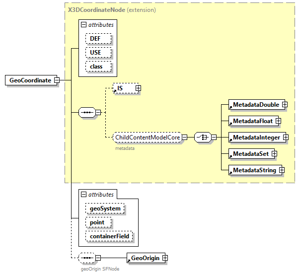 | source | <xs:element name="GeoCoordinate"> <xs:annotation> <xs:appinfo> <xs:element name="geoOrigin" type="SFNode" fixed="initializeOnlyField" default="GeoOrigin"/> <xs:attribute name="componentName" type="componentNameChoices" fixed="Geospatial"/> <xs:attribute name="componentLevel" type="xs:positiveInteger" fixed="1"/> </xs:appinfo> <xs:documentation source="https://www.web3d.org/documents/specifications/19775-1/V3.3/Part01/components/geodata.html#GeoCoordinate"/> </xs:annotation> <xs:complexType> <xs:complexContent> <xs:extension base="X3DCoordinateNode"> <xs:sequence minOccurs="0"> <xs:annotation> <xs:documentation>geoOrigin SFNode</xs:documentation> </xs:annotation> <xs:element ref="GeoOrigin"/> </xs:sequence> <xs:attribute name="geoSystem" type="geoSystemType" default='"GD" "WE"'/> <xs:attribute name="point" type="MFVec3d"/> <xs:attribute name="containerField" type="xs:NMTOKEN" default="coord"/> </xs:extension> </xs:complexContent> </xs:complexType> </xs:element> |
