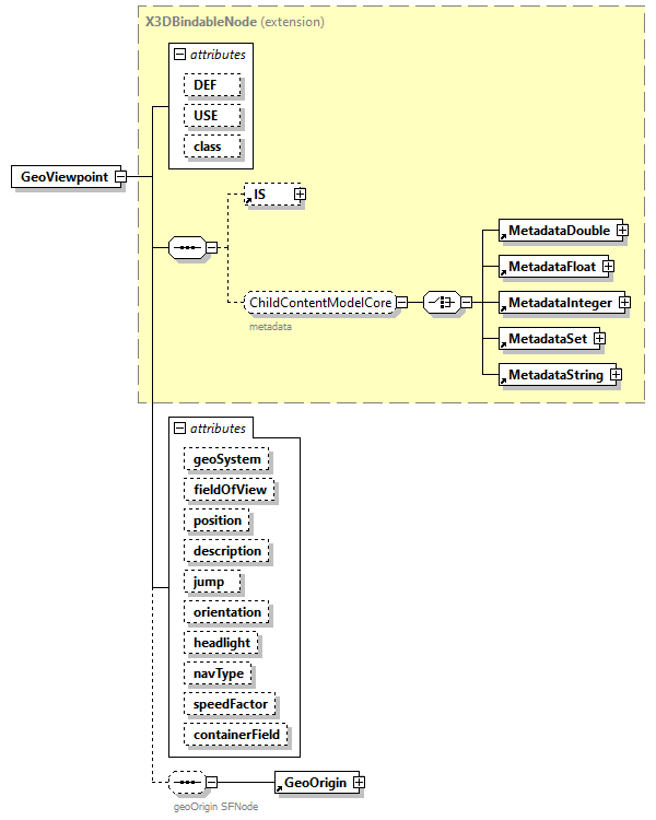 | source | <xs:element name="GeoViewpoint"> <xs:annotation> <xs:appinfo> <xs:element name="geoOrigin" type="SFNode" fixed="initializeOnlyField" default="GeoOrigin"/> <xs:attribute name="componentName" type="componentNameChoices" fixed="Geospatial"/> <xs:attribute name="componentLevel" type="xs:positiveInteger" fixed="1"/> <!-- X3D version 3.3 GeoViewpoint changes: added centerOfRotation and retainUserOffsets, removed navType and headlight, removed set_position and set_orientation --> </xs:appinfo> <xs:documentation source="https://www.web3d.org/documents/specifications/19775-1/V3.3/Part01/components/geodata.html#GeoViewpoint"/> </xs:annotation> <xs:complexType> <xs:complexContent> <xs:extension base="X3DBindableNode"> <xs:sequence minOccurs="0"> <xs:annotation> <xs:documentation>geoOrigin SFNode</xs:documentation> </xs:annotation> <xs:element ref="GeoOrigin"/> </xs:sequence> <xs:attribute name="geoSystem" type="geoSystemType" default='"GD" "WE"'/> <xs:attribute name="fieldOfView" default="0.7854"> <xs:simpleType> <xs:restriction base="SFFloat"> <xs:minExclusive value="0"/> <xs:maxExclusive value="3.1416"/> </xs:restriction> </xs:simpleType> </xs:attribute> <xs:attribute name="position" type="SFVec3d" default="0 0 100000"/> <xs:attribute name="description" type="SFString"/> <xs:attribute name="jump" type="SFBool" default="true"/> <xs:attribute name="orientation" type="SFRotation" default="0 0 1 0"/> <xs:attribute name="headlight" type="SFBool" default="true"/> <xs:attribute name="navType" type="MFString" default='"EXAMINE" "ANY"'/> <xs:attribute name="speedFactor" default="1.0"> <xs:simpleType> <xs:restriction base="SFFloat"> <xs:minInclusive value="0"/> </xs:restriction> </xs:simpleType> </xs:attribute> <xs:attribute name="containerField" type="xs:NMTOKEN" default="children"/> </xs:extension> <!-- centerOfRotation added in X3D version 3.1 --> <!-- retainUserOffsets added in X3D version 3.1 --> <!-- X3DViewpointNode node hierarchy modified in X3D version 3.2 --> </xs:complexContent> </xs:complexType> </xs:element> |