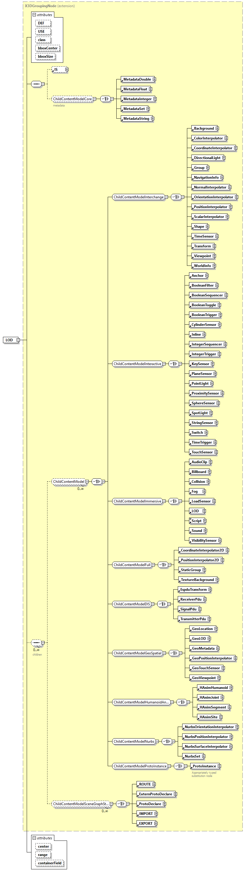 | source | <xs:element name="LOD"> <xs:annotation> <xs:appinfo> <xs:attribute name="center" type="SFVec3f" default="0 0 0" fixed="initializeOnlyField"/> <!-- level_changed added in X3D version 3.1 --> <xs:attribute name="componentName" type="componentNameChoices" fixed="Navigation"/> <xs:attribute name="componentLevel" type="xs:positiveInteger" fixed="2"/> </xs:appinfo> <xs:documentation source="https://www.web3d.org/documents/specifications/19775-1/V3.3/Part01/components/navigation.html#LOD"/> </xs:annotation> <xs:complexType> <xs:complexContent> <xs:extension base="X3DGroupingNode"> <xs:attribute name="center" type="SFVec3f" default="0 0 0"/> <xs:attribute name="range" type="MFFloat"/> <xs:attribute name="containerField" type="containerFieldChoicesGroupLODShapeTransform" default="children"/> </xs:extension> <!-- forceTransitions added in X3D version 3.1 --> </xs:complexContent> </xs:complexType> </xs:element> |