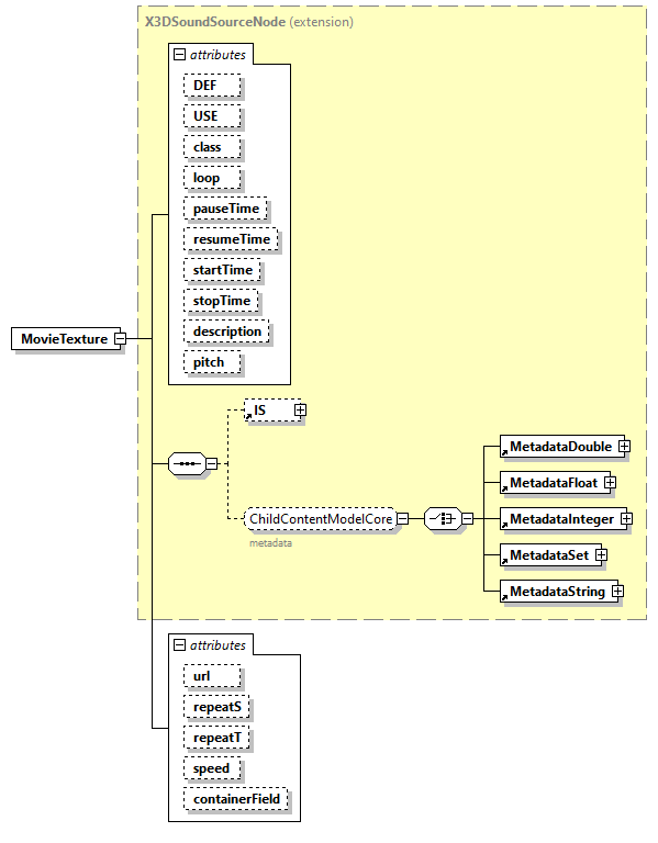 | source | <xs:element name="MovieTexture"> <xs:annotation> <xs:appinfo> <!-- textureProperties in X3D version 3.2 --> <xs:attribute name="additionalInterface" type="xs:string" default="X3DTexture2DNode"/> <xs:attribute name="additionalInterface" type="xs:string" default="X3DUrlObject"/> <xs:attribute name="componentName" type="componentNameChoices" fixed="Texturing"/> <xs:attribute name="componentLevel" type="xs:positiveInteger" fixed="3"/> </xs:appinfo> <xs:documentation source="https://www.web3d.org/documents/specifications/19775-1/V3.3/Part01/components/texturing.html#MovieTexture"/> </xs:annotation> <xs:complexType> <xs:complexContent> <xs:extension base="X3DSoundSourceNode"> <xs:attribute name="url" type="MFString"> <xs:annotation> <xs:appinfo> <xs:attribute name="componentName" type="componentNameChoices" fixed="Networking"/> <xs:attribute name="componentLevel" type="xs:positiveInteger" fixed="4"/> </xs:appinfo> </xs:annotation> </xs:attribute> <xs:attribute name="repeatS" type="SFBool" default="true"/> <xs:attribute name="repeatT" type="SFBool" default="true"/> <xs:attribute name="speed" type="SFFloat" default="1.0"/> <xs:attribute name="containerField" type="containerFieldChoicesX3dUrlObjectTexture" default="texture"/> </xs:extension> </xs:complexContent> </xs:complexType> </xs:element> |