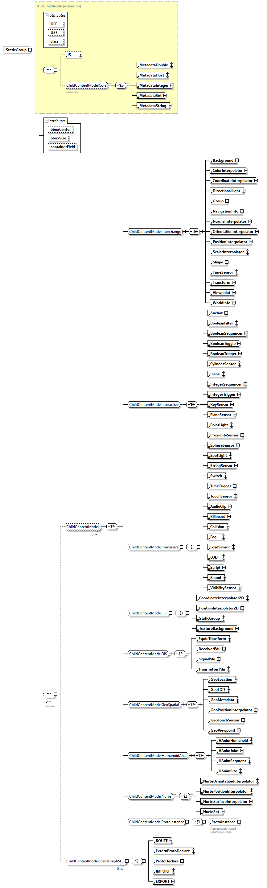 | children | IS MetadataDouble MetadataFloat MetadataInteger MetadataSet MetadataString Background ColorInterpolator CoordinateInterpolator DirectionalLight Group NavigationInfo NormalInterpolator OrientationInterpolator PositionInterpolator ScalarInterpolator Shape TimeSensor Transform Viewpoint WorldInfo Anchor BooleanFilter BooleanSequencer BooleanToggle BooleanTrigger CylinderSensor Inline IntegerSequencer IntegerTrigger KeySensor PlaneSensor PointLight ProximitySensor SphereSensor SpotLight StringSensor Switch TimeTrigger TouchSensor AudioClip Billboard Collision Fog LoadSensor LOD Script Sound VisibilitySensor CoordinateInterpolator2D PositionInterpolator2D StaticGroup TextureBackground EspduTransform ReceiverPdu SignalPdu TransmitterPdu GeoLocation GeoLOD GeoMetadata GeoPositionInterpolator GeoTouchSensor GeoViewpoint HAnimHumanoid HAnimJoint HAnimSegment HAnimSite NurbsOrientationInterpolator NurbsPositionInterpolator NurbsSurfaceInterpolator NurbsSet ProtoInstance ROUTE ExternProtoDeclare ProtoDeclare IMPORT EXPORT | ||||||||||||||||||||||||||||||||||||||||||||||||