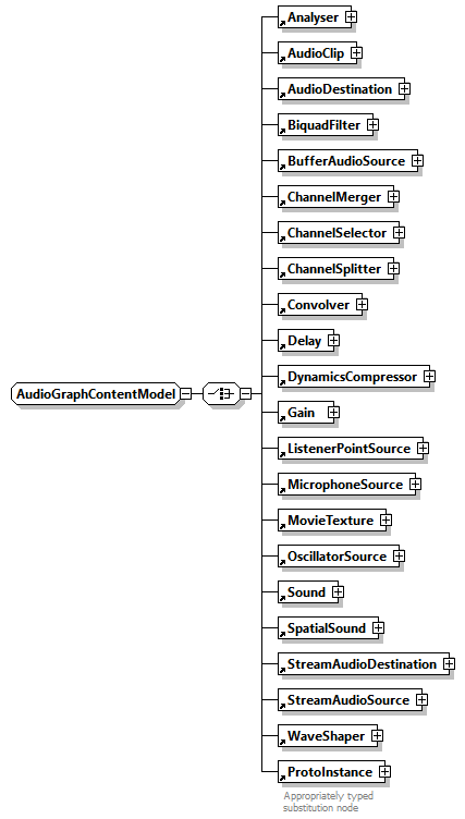 | source | <xs:group name="AudioGraphContentModel"> <xs:annotation> <xs:appinfo>AudioGraphContentModel is the child-node content model corresponding to composable input nodes for sound processing nodes.</xs:appinfo> <xs:documentation source="https://www.web3d.org/specifications/X3Dv4/ISO-IEC19775-1v4-IS/Part01/components/grouping.html#GroupingAndChildrenNodes"/> </xs:annotation> <xs:choice> <xs:element ref="Analyser"/> <xs:element ref="AudioClip"/> <xs:element ref="AudioDestination"/> <xs:element ref="BiquadFilter"/> <xs:element ref="BufferAudioSource"/> <xs:element ref="ChannelMerger"/> <xs:element ref="ChannelSelector"/> <xs:element ref="ChannelSplitter"/> <xs:element ref="Convolver"/> <xs:element ref="Delay"/> <xs:element ref="DynamicsCompressor"/> <xs:element ref="Gain"/> <xs:element ref="ListenerPointSource"/> <xs:element ref="MicrophoneSource"/> <xs:element ref="MovieTexture"/> <xs:element ref="OscillatorSource"/> <xs:element ref="Sound"/> <xs:element ref="SpatialSound"/> <xs:element ref="StreamAudioDestination"/> <xs:element ref="StreamAudioSource"/> <xs:element ref="WaveShaper"/> <xs:element ref="ProtoInstance"> <xs:annotation> <xs:documentation>Appropriately typed substitution node</xs:documentation> </xs:annotation> </xs:element> </xs:choice> </xs:group> |
