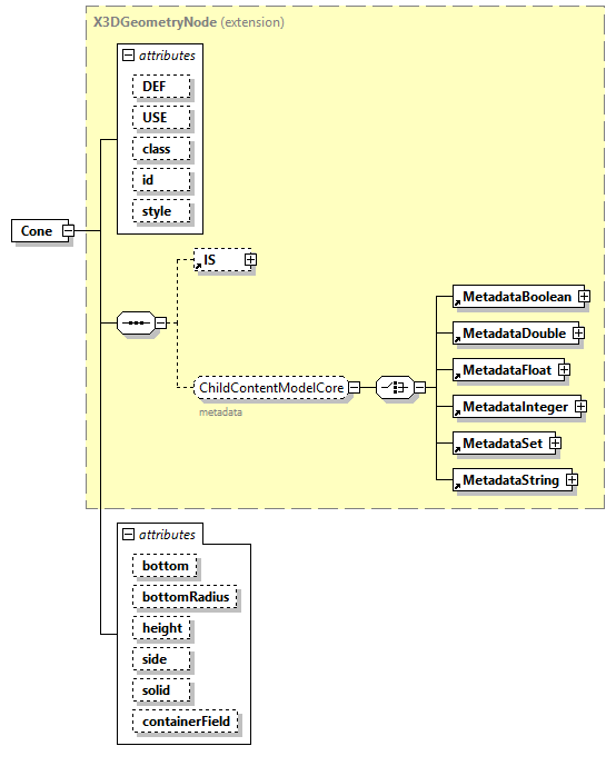 | source | <xs:element name="Cone"> <xs:annotation> <xs:appinfo> <xs:attribute name="solid" type="SFBool" default="true" fixed="initializeOnlyField"/> <xs:attribute name="componentName" type="componentNameChoices" fixed="Geometry3D"/> <xs:attribute name="componentLevel" type="xs:positiveInteger" fixed="1"/> </xs:appinfo> <xs:documentation source="https://www.web3d.org/specifications/X3Dv4/ISO-IEC19775-1v4-IS/Part01/components/geometry3D.html#Cone"/> </xs:annotation> <xs:complexType> <xs:complexContent> <xs:extension base="X3DGeometryNode"> <xs:attribute name="bottom" type="SFBool" default="true"/> <xs:attribute name="bottomRadius" default="1"> <!-- type="SFFloatPositive" --> <xs:simpleType> <xs:restriction base="SFFloat"> <xs:minExclusive value="0"/> </xs:restriction> </xs:simpleType> </xs:attribute> <xs:attribute name="height" default="2"> <!-- type="SFFloatPositive" --> <xs:simpleType> <xs:restriction base="SFFloat"> <xs:minExclusive value="0"/> </xs:restriction> </xs:simpleType> </xs:attribute> <xs:attribute name="side" type="SFBool" default="true"/> <xs:attribute name="solid" type="SFBool" default="true"/> <xs:attribute name="containerField" type="xs:NMTOKEN" default="geometry"/> </xs:extension> </xs:complexContent> </xs:complexType> </xs:element> |