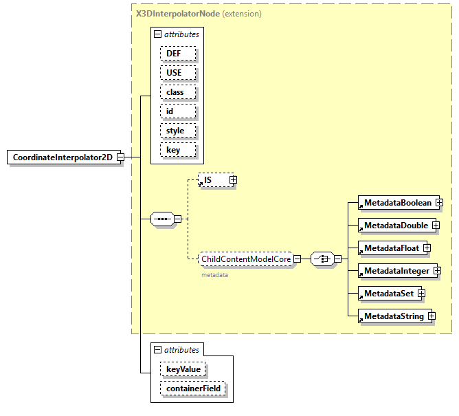 | source | <xs:element name="CoordinateInterpolator2D"> <xs:annotation> <xs:appinfo> <xs:attribute name="value_changed" type="MFVec2f" fixed="outputOnlyField"/> <xs:attribute name="componentName" type="componentNameChoices" fixed="Interpolation"/> <xs:attribute name="componentLevel" type="xs:positiveInteger" fixed="3"/> </xs:appinfo> <xs:documentation source="https://www.web3d.org/specifications/X3Dv4/ISO-IEC19775-1v4-IS/Part01/components/interpolators.html#CoordinateInterpolator2D"/> </xs:annotation> <xs:complexType> <xs:complexContent> <xs:extension base="X3DInterpolatorNode"> <xs:attribute name="keyValue" type="MFVec2f"/> <xs:attribute name="containerField" type="xs:NMTOKEN" default="children"/> </xs:extension> </xs:complexContent> </xs:complexType> </xs:element> |
