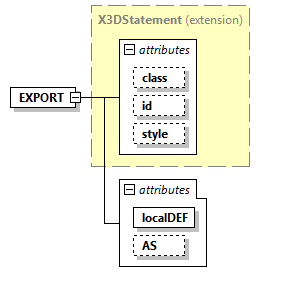 | source | <xs:element name="EXPORT"> <xs:annotation> <xs:appinfo> <xs:attribute name="componentName" type="componentNameChoices" fixed="Networking"/> <xs:attribute name="componentLevel" type="xs:positiveInteger" fixed="3"/> Functional summary: EXPORT exposes a local node for ROUTE passing of event values when the current Scene is included via Inline by a parent external world. These connections allow event values to be exchanged via ROUTE statements between a parent model and a child Inline model. </xs:appinfo> <xs:documentation source="https://www.web3d.org/specifications/X3Dv4/ISO-IEC19775-1v4-IS/Part01/concepts.html#ImportExportsemantics"/> </xs:annotation> <xs:complexType> <xs:complexContent> <xs:extension base="X3DStatement"> <xs:attribute name="localDEF" type="xs:IDREF" use="required"/> <xs:attribute name="AS" type="xs:NMTOKEN"/> </xs:extension> </xs:complexContent> </xs:complexType> </xs:element> |