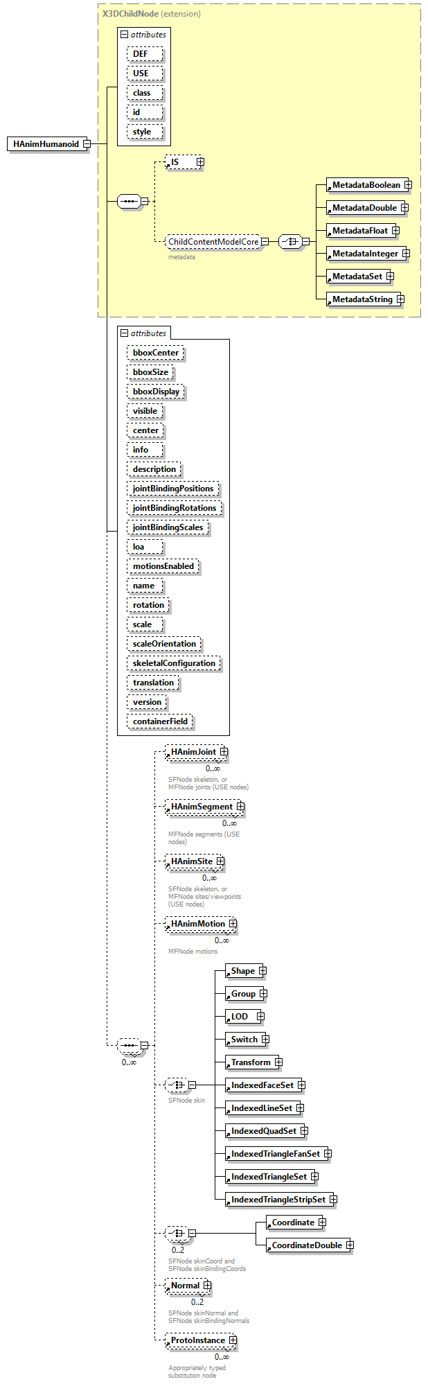 | source | <xs:element name="HAnimHumanoid"> <xs:annotation> <xs:appinfo> <xs:element name="joints" type="MFNode" fixed="inputOutputField" default="HAnimJoint"/> <xs:element name="segments" type="MFNode" fixed="inputOutputField" default="HAnimSegment"/> <xs:element name="sites" type="MFNode" fixed="inputOutputField" default="HAnimSite"/> <xs:element name="skeleton" type="MFNode" fixed="inputOutputField" default="HAnimJoint|HAnimSite"/> <xs:element name="skin" type="MFNode" fixed="inputOutputField" default="Group|Transform|Shape|IndexedFaceSet"/> <xs:element name="skinCoord" type="SFNode" fixed="inputOutputField" default="Coordinate|CoordinateDouble"/> <xs:element name="skinNormal" type="SFNode" fixed="inputOutputField" default="X3DNormalNode"/> <xs:element name="viewpoints" type="MFNode" fixed="inputOutputField" default="HAnimSite"> <!-- viewpoints field does not contain Viewpoint nodes, rather contains HAnimSite/Viewpoint pairs --> </xs:element> <xs:element name="motions" type="MFNode" fixed="inputOutputField" default="HAnimMotion"/> <xs:element name="skinBindingCoords" type="SFNode" fixed="inputOutputField" default="Coordinate|CoordinateDouble"/> <xs:element name="skinBindingNormals" type="SFNode" fixed="inputOutputField" default="X3DNormalNode"/> <xs:attribute name="additionalInterface" type="xs:string" default="X3DBoundedObject"/> <xs:attribute name="componentName" type="componentNameChoices" fixed="HAnim"/> <xs:attribute name="componentLevel" type="xs:positiveInteger" fixed="1"/> </xs:appinfo> <xs:documentation source="https://www.web3d.org/specifications/X3Dv4/ISO-IEC19775-1v4-IS/Part01/components/hanim.html#HAnimHumanoid"/> <!-- HAnim specification https://www.web3d.org/documents/specifications/19774/V2.0/Architecture/ObjectInterfaces.html#Humanoid --> </xs:annotation> <xs:complexType> <xs:complexContent> <xs:extension base="X3DChildNode"> <xs:sequence minOccurs="0" maxOccurs="unbounded"> <xs:element ref="HAnimJoint" minOccurs="0" maxOccurs="unbounded"> <xs:annotation> <xs:documentation>SFNode skeleton, or MFNode joints (USE nodes)</xs:documentation> </xs:annotation> </xs:element> <xs:element ref="HAnimSegment" minOccurs="0" maxOccurs="unbounded"> <xs:annotation> <xs:documentation>MFNode segments (USE nodes)</xs:documentation> </xs:annotation> </xs:element> <xs:element ref="HAnimSite" minOccurs="0" maxOccurs="unbounded"> <xs:annotation> <xs:documentation>SFNode skeleton, or MFNode sites/viewpoints (USE nodes)</xs:documentation> </xs:annotation> </xs:element> <xs:element ref="HAnimMotion" minOccurs="0" maxOccurs="unbounded"> <xs:annotation> <xs:documentation>MFNode motions</xs:documentation> </xs:annotation> </xs:element> <xs:choice minOccurs="0" maxOccurs="1"> <xs:annotation> <xs:documentation>SFNode skin</xs:documentation> </xs:annotation> <xs:element ref="Shape"/> <xs:element ref="Group"/> <xs:element ref="LOD"/> <xs:element ref="Switch"/> <xs:element ref="Transform"/> <xs:element ref="IndexedFaceSet"/> <xs:element ref="IndexedLineSet"/> <xs:element ref="IndexedQuadSet"/> <xs:element ref="IndexedTriangleFanSet"/> <xs:element ref="IndexedTriangleSet"/> <xs:element ref="IndexedTriangleStripSet"/> </xs:choice> <xs:choice minOccurs="0" maxOccurs="2"> <xs:annotation> <xs:documentation>SFNode skinCoord and SFNode skinBindingCoords</xs:documentation> </xs:annotation> <xs:element ref="Coordinate"/> <xs:element ref="CoordinateDouble"/> </xs:choice> <xs:element ref="Normal" minOccurs="0" maxOccurs="2"> <xs:annotation> <xs:documentation>SFNode skinNormal and SFNode skinBindingNormals</xs:documentation> </xs:annotation> </xs:element> <xs:element ref="ProtoInstance" minOccurs="0" maxOccurs="unbounded"> <xs:annotation> <xs:documentation>Appropriately typed substitution node</xs:documentation> </xs:annotation> </xs:element> </xs:sequence> <xs:attribute name="bboxCenter" type="SFVec3f" default="0 0 0"/> <xs:attribute name="bboxSize" type="bboxSizeType" default="-1 -1 -1"/> <xs:attribute name="bboxDisplay" type="SFBool" default="false"/> <xs:attribute name="visible" type="SFBool" default="true"/> <xs:attribute name="center" type="SFVec3f" default="0 0 0"/> <xs:attribute name="info" type="MFString"/> <xs:attribute name="description" type="SFString"> <xs:annotation> <xs:appinfo>added in X3D version 4</xs:appinfo> </xs:annotation> </xs:attribute> <xs:attribute name="jointBindingPositions" type="MFVec3f"/> <xs:attribute name="jointBindingRotations" type="MFRotation"/> <xs:attribute name="jointBindingScales" type="MFVec3f" default=""/> <xs:attribute name="loa" type="loaType" default="-1"/> <xs:attribute name="motionsEnabled" type="MFBool"/> <xs:attribute name="name" type="xs:NMTOKEN"> <xs:annotation> <xs:appinfo>name attribute is ordinarily required, unless this is a USE node</xs:appinfo> <!-- Design note: cannot REQUIRE @name field or else USE nodes incorrectly fail to validate --> <xs:documentation source="https://www.web3d.org/x3d/content/examples/X3dSceneAuthoringHints.html#NameTyping"/> </xs:annotation> </xs:attribute> <xs:attribute name="rotation" type="SFRotation" default="0 0 1 0"/> <xs:attribute name="scale" type="SFVec3f" default="1 1 1"> <xs:annotation> <xs:appinfo> <xs:minExclusive value="0"/> </xs:appinfo> </xs:annotation> </xs:attribute> <xs:attribute name="scaleOrientation" type="SFRotation" default="0 0 1 0"/> <xs:attribute name="skeletalConfiguration" type="SFString" default="BASIC"/> <xs:attribute name="translation" type="SFVec3f" default="0 0 0"/> <xs:attribute name="version" type="hanimVersionChoices" default="2.0"/> <xs:attribute name="containerField" type="xs:NMTOKEN" default="children"/> </xs:extension> <!-- multiple fields added in X3D version 4.0 --> <!-- TODO when specification is revised: <xs:attribute name="authorName" type="SFString"/> <xs:attribute name="authorEmail" type="SFString"/> <xs:attribute name="copyright" type="SFString"/> <xs:attribute name="creationDate" type="SFString"/> <xs:attribute name="usageRestrictions" type="SFString"/> <xs:attribute name="humanoidVer