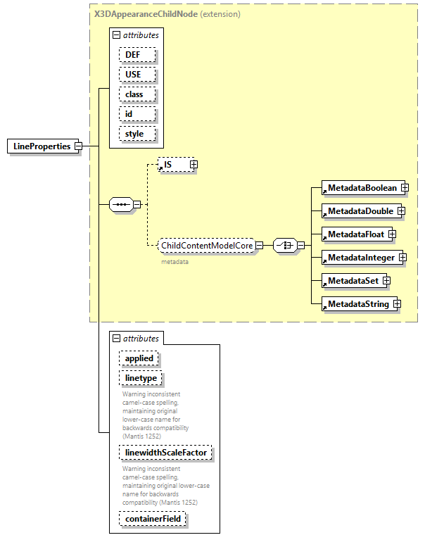 | source | <xs:element name="LineProperties"> <xs:annotation> <xs:appinfo> <xs:attribute name="componentName" type="componentNameChoices" fixed="Shape"/> <xs:attribute name="componentLevel" type="xs:positiveInteger" fixed="2"/> </xs:appinfo> <xs:documentation source="https://www.web3d.org/specifications/X3Dv4/ISO-IEC19775-1v4-IS/Part01/components/shape.html#LineProperties"/> </xs:annotation> <xs:complexType> <xs:complexContent> <xs:extension base="X3DAppearanceChildNode"> <xs:attribute name="applied" type="SFBool" default="true"/> <xs:attribute name="linetype" type="lineTypeValues" default="1"> <xs:annotation> <xs:appinfo> <xs:attribute name="alias" type="xs:string" fixed="lineType"/> </xs:appinfo> <xs:documentation>Warning inconsistent camel-case spelling, maintaining original lower-case name for backwards compatibility (Mantis 1252)</xs:documentation> </xs:annotation> </xs:attribute> <xs:attribute name="linewidthScaleFactor" type="SFFloat" default="0"> <xs:annotation> <xs:appinfo> <xs:attribute name="alias" type="xs:string" fixed="lineWidthScaleFactor"/> </xs:appinfo> <xs:documentation>Warning inconsistent camel-case spelling, maintaining original lower-case name for backwards compatibility (Mantis 1252)</xs:documentation> </xs:annotation> </xs:attribute> <xs:attribute name="containerField" type="xs:NMTOKEN" default="lineProperties"/> </xs:extension> </xs:complexContent> </xs:complexType> </xs:element> |