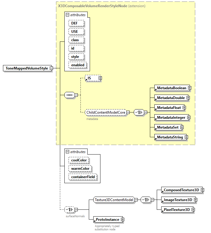 | source | <xs:element name="ToneMappedVolumeStyle"> <xs:annotation> <xs:appinfo> <xs:element name="surfaceNormals" type="SFNode" fixed="inputOutputField" default="X3DTexture3DNode"/> <xs:attribute name="componentName" type="componentNameChoices" fixed="VolumeRendering"/> <xs:attribute name="componentLevel" type="xs:positiveInteger" fixed="2"/> </xs:appinfo> <xs:documentation source="https://www.web3d.org/specifications/X3Dv4/ISO-IEC19775-1v4-IS/Part01/components/volume.html#ToneMappedVolumeStyle"/> </xs:annotation> <xs:complexType> <xs:complexContent> <xs:extension base="X3DComposableVolumeRenderStyleNode"> <xs:choice minOccurs="0" maxOccurs="1"> <xs:annotation> <xs:documentation>surfaceNormals</xs:documentation> </xs:annotation> <xs:group ref="Texture3DContentModel"/> <xs:element ref="ProtoInstance"> <xs:annotation> <xs:documentation>Appropriately typed substitution node</xs:documentation> </xs:annotation> </xs:element> </xs:choice> <xs:attribute name="coolColor" type="SFColorRGBA" default="0 0 1 0"/> <xs:attribute name="warmColor" type="SFColorRGBA" default="1 1 0 0"/> <xs:attribute name="containerField" type="xs:NMTOKEN" default="renderStyle"/> </xs:extension> </xs:complexContent> </xs:complexType> </xs:element> |