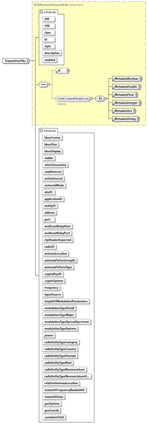 | source | <xs:element name="TransmitterPdu"> <xs:annotation> <xs:appinfo> <xs:attribute name="isNetworkReader" type="SFBool" fixed="outputOnlyField"/> <xs:attribute name="isNetworkWriter" type="SFBool" fixed="outputOnlyField"/> <xs:attribute name="isRtpHeaderHeard" type="SFBool" fixed="outputOnlyField"/> <xs:attribute name="isStandAlone" type="SFBool" fixed="outputOnlyField"/> <xs:attribute name="timestamp" fixed="outputOnlyField"> <!-- type="SFTimeNonNegative" --> <xs:simpleType> <xs:restriction base="SFTime"> <xs:minInclusive value="0"/> </xs:restriction> </xs:simpleType> </xs:attribute> <xs:attribute name="additionalInterface" type="xs:string" default="X3DBoundedObject"/> <xs:attribute name="componentName" type="componentNameChoices" fixed="DIS"/> <xs:attribute name="componentLevel" type="xs:positiveInteger" fixed="1"/> </xs:appinfo> <xs:documentation source="https://www.web3d.org/specifications/X3Dv4/ISO-IEC19775-1v4-IS/Part01/components/dis.html#TransmitterPdu"/> </xs:annotation> <xs:complexType> <xs:complexContent> <xs:extension base="X3DNetworkSensorNode"> <xs:attribute name="bboxCenter" type="SFVec3f" default="0 0 0"/> <xs:attribute name="bboxSize" type="bboxSizeType" default="-1 -1 -1"/> <xs:attribute name="bboxDisplay" type="SFBool" default="false"/> <xs:attribute name="visible" type="SFBool" default="true"/> <xs:attribute name="whichGeometry" type="SFInt32" default="1"/> <xs:attribute name="readInterval" default="0.1"> <!-- type="SFTimeNonNegative" --> <xs:simpleType> <xs:restriction base="SFTime"> <xs:minInclusive value="0"/> </xs:restriction> </xs:simpleType> </xs:attribute> <xs:attribute name="writeInterval" default="1.0"> <!-- type="SFTimeNonNegative" --> <xs:simpleType> <xs:restriction base="SFTime"> <xs:minInclusive value="0"/> </xs:restriction> </xs:simpleType> </xs:attribute> <xs:attribute name="networkMode" type="networkModeChoices" default="standAlone"/> <xs:attribute name="siteID" type="SFInt32" default="0"/> <xs:attribute name="applicationID" type="SFInt32" default="0"/> <xs:attribute name="entityID" type="SFInt32" default="0"/> <xs:attribute name="address" type="SFString" default="localhost"/> <xs:attribute name="port" type="SFInt32" default="0"/> <xs:attribute name="multicastRelayHost" type="SFString"/> <xs:attribute name="multicastRelayPort" type="SFInt32" default="0"/> <xs:attribute name="rtpHeaderExpected" type="SFBool" default="false"/> <xs:attribute name="radioID" type="SFInt32" default="0"/> <xs:attribute name="antennaLocation" type="SFVec3f" default="0 0 0"/> <xs:attribute name="antennaPatternLength" type="SFInt32" default="0"/> <xs:attribute name="antennaPatternType" type="SFInt32" default="0"/> <xs:attribute name="cryptoKeyID" type="SFInt32" default="0"/> <xs:attribute name="cryptoSystem" type="SFInt32" default="0"/> <xs:attribute name="frequency" default="0"> <xs:simpleType> <xs:restriction base="SFInt32"> <xs:minInclusive value="0"/> </xs:restriction> </xs:simpleType> </xs:attribute> <xs:attribute name="inputSource" type="SFInt32" default="0"/> <xs:attribute name="lengthOfModulationParameters" type="SFInt32" default="0"/> <xs:attribute name="modulationTypeDetail" type="SFInt32" default="0"/> <xs:attribute name="modulationTypeMajor" type="SFInt32" default="0"/> <xs:attribute name="modulationTypeSpreadSpectrum" type="SFInt32" default="0"/> <xs:attribute name="modulationTypeSystem" type="SFInt32" default="0"/> <xs:attribute name="power" type="SFFloat" default="0.0"/> <xs:attribute name="radioEntityTypeCategory" type="SFInt32" default="0"/> <xs:attribute name="radioEntityTypeCountry" type="SFInt32" default="0"/> <xs:attribute name="radioEntityTypeDomain" type="SFInt32" default="0"/> <xs:attribute name="radioEntityTypeKind" type="SFInt32" default="0"/> <xs:attribute name="radioEntityTypeNomenclature" type="SFInt32" default="0"/> <xs:attribute name="radioEntityTypeNomenclatureVersion" type="SFInt32" default="0"/> <xs:attribute name="relativeAntennaLocation" type="SFVec3f" default="0 0 0"/> <xs:attribute name="transmitFrequencyBandwidth" type="SFFloat" default="0"/> <xs:attribute name="transmitState" type="SFInt32" default="0"/> <xs:attribute name="geoSystem" type="geoSystemType" default='"GD" "WE"'/> <xs:attribute name="geoCoords" type="SFVec3d" default="0 0 0"/> <xs:attribute name="containerField" type="xs:NMTOKEN" default="children"/> </xs:extension> </xs:complexContent> </xs:complexType> </xs:element> |