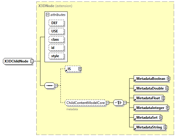 | source | <xs:complexType name="X3DChildNode" abstract="true"> <xs:annotation> <xs:appinfo> <xs:attribute name="componentName" type="componentNameChoices" fixed="Core"/> <xs:attribute name="componentLevel" type="xs:positiveInteger" fixed="1"/> A node that implements X3DChildNode is one of the legal children for a X3DGroupingNode parent. </xs:appinfo> <xs:documentation source="https://www.web3d.org/specifications/X3Dv4/ISO-IEC19775-1v4-IS/Part01/components/core.html#X3DChildNode"/> </xs:annotation> <xs:complexContent> <xs:extension base="X3DNode"/> </xs:complexContent> </xs:complexType> |