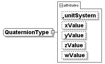 | source | <xs:complexType name="QuaternionType"> <xs:complexContent> <xs:extension base="FullyExtensibleSMALElementType"> <xs:attribute ref="unitSystem"/> <xs:attribute name="xValue" type="unitValueFloat" default="0"/> <xs:attribute name="yValue" type="unitValueFloat" default="0"/> <xs:attribute name="zValue" type="unitValueFloat" default="0"/> <xs:attribute name="wValue" type="nonNegativeFloat" default="0"/> </xs:extension> </xs:complexContent> </xs:complexType> |