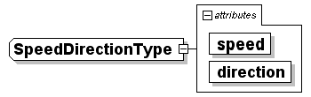 | source | <xs:complexType name="SpeedDirectionType"> <xs:annotation> <xs:appinfo>Super-type containing the base attributes for elements which describe the speed and direction of an object or phenomena using attribute values.</xs:appinfo> </xs:annotation> <xs:complexContent> <xs:extension base="FullyExtensibleSMALElementType"> <xs:attribute name="speed" type="nonNegativeFloat" use="required"/> <xs:attribute name="direction" type="degreeType" use="required"/> </xs:extension> </xs:complexContent> </xs:complexType> |