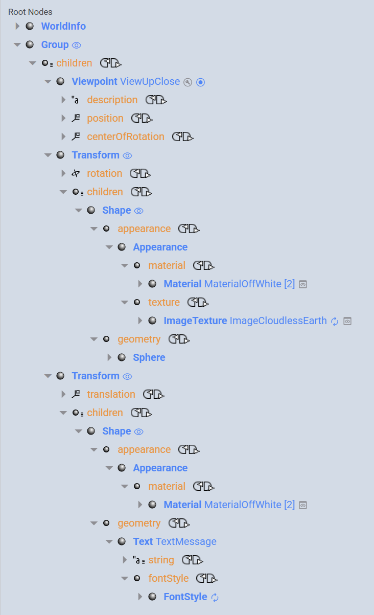 For additional help information about X3D scenes, please see X3D Tooltips, X3D Resources, and X3D Scene Authoring Hints.