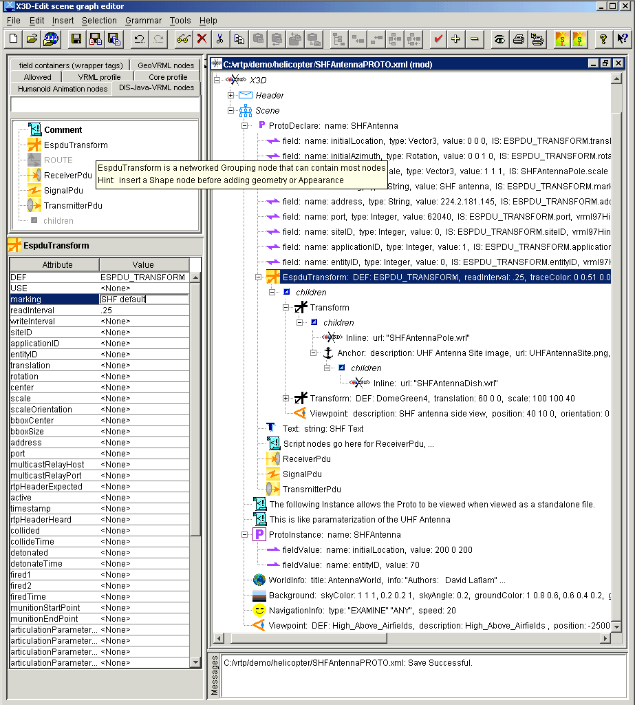 X3D-Edit 3.1 is a graphics file editor for Extensible 3D (X3D) that enables simple error-free editing, authoring and validation of X3D or VRML scene-graph files. Context-sensitive tooltips provide concise summaries of each VRML node and attribute. These tooltips simplify authoring and improve understanding for novice and expert users alike.