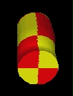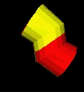 Map a PixelTexture image to an Extrusion. The PixelTexture is RED (lower left quarter), YELLOW (lower right quarter), YELLOW (upper left quarter) and RED (upper right quarter). A PixelTexture is applied to an Extrusion by aligning the bottom of the PixelTexture with the first cross-section at the first spint point, and the top of the PixelTexture coincides with the last cross-section at the last spine point. The left side of the PixelTexture is aligned with the first cross-section point of all spine points, and the right side of the PixelTexture coincides with the last cross-section point for all spine points. For the ends of the extrusion, The PixelTexture will map with the S (horizontal) texture axis aligning with the X axis of the cap, and the T (vertical) texture axis aligning with the Z axis of the cap.